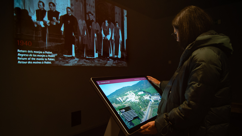 L’espai està dividit en tres àmbits temàtics. El primer presenta dos projeccions i dos interactius que expliquen tant l’evolució de l’orde del Císter, como la del propi monestir. Per a conèixer aquesta evolució es pot visionar una recreació virtual de la transformació arquitectònica de Poblet al llarg dels segles. La sala segona utilitza la força de les imatges per crear un espai emotiu que reivindica l’espiritualitat com un patrimoni de totes les persones, pobles i cultures. En la tercera sala, un audiovisual immersiu presenta la vida de la comunitat de monjos al voltant del claustre.